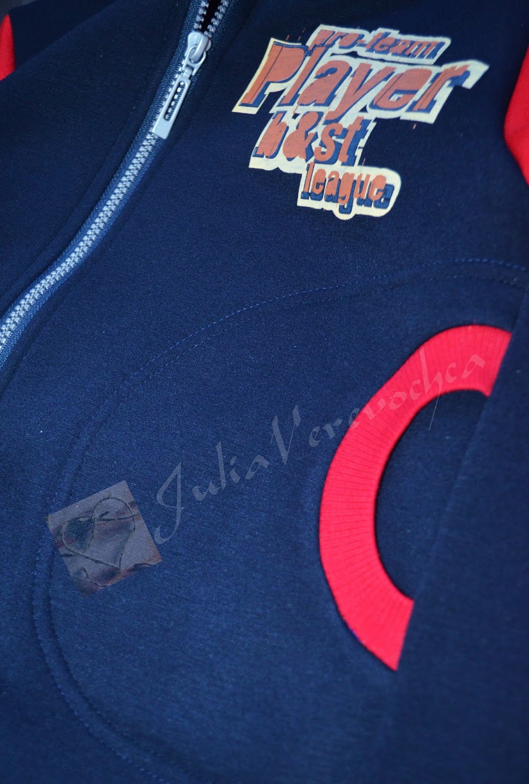 Классическая толстовка-курточка а-ля колледж у американских (и не только) подростков. Синий основной и красные рукава и вся уляпана картинками американского футбола. Увидев новые трикотажи на меху, в голове щелкнуло